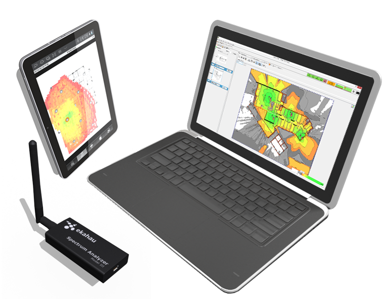 Używany Analizator widma firmy Ekahau, umożliwia dokładne określenie źródeł interferencji, które mogą ograniczać transfery w sieci bezprzewodowej, bądź nawet uniemożliwiać komunikację w przypadku urządzeń mobilnych z mniej czułymi odbiornikami WiFi.