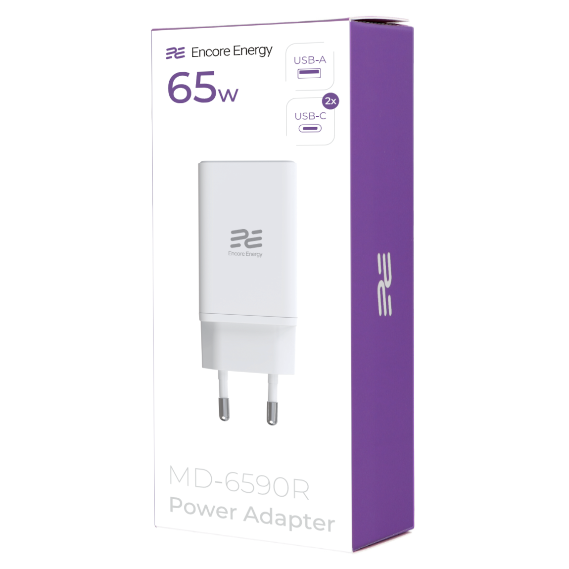 Ładowarka sieciowa Encore Energy Slim z trzema portami: USB-A i USB-C x 2. Kompaktowy zasilacz z technologią GaN i standardami: PPS , PD, QC, BC 1.2, AFC, FCP, SCP, Apple 5V/2.4A. Moc max 65W. Zestaw z kablem Encore Energy USB-C x2 50 cm.