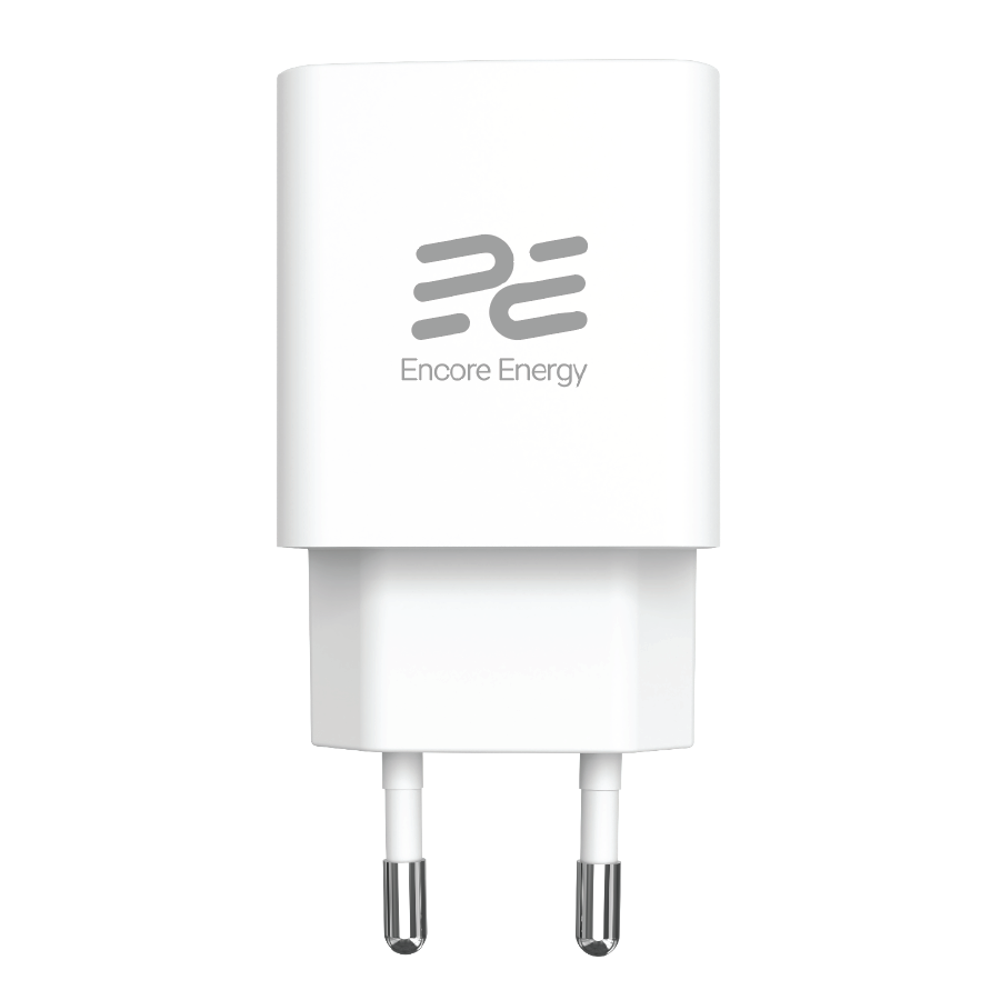 Ładowarka sieciowa Encore Energy z dwoma portami: USB-A oraz USB-C. Zasilacz z technologią GaN i standardami ładowania: PD, QC BC 1.2, AFC, FCP, SCP, Apple 5V/2.4A. Moc maksymalna 25W. Zestaw z kablem Encore Energy USB-C 1m.